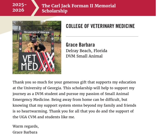 All proceeds after race expenses fund the Carl Jack Forman II Memorial Scholarship which is presented to a student at the University of Georgia College of Veterinary Medicine who is hardworking, shows compassionate care for animals and demonstrates financial need. Observant, attention to detail, thoughtfulness and competency, all characteristics which Carl Jack Forman so embodied, this student shall also possess. A student with a focus in Critical and Emergency care will be given preference. Also when available preference will be given to a student from Flagler County.